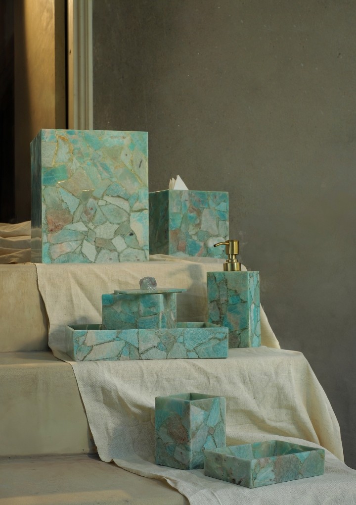 Bring home this Amazonite Bathroom Set and infuse your personal sanctuary with the tranquil energy of nature’s own gemstone.