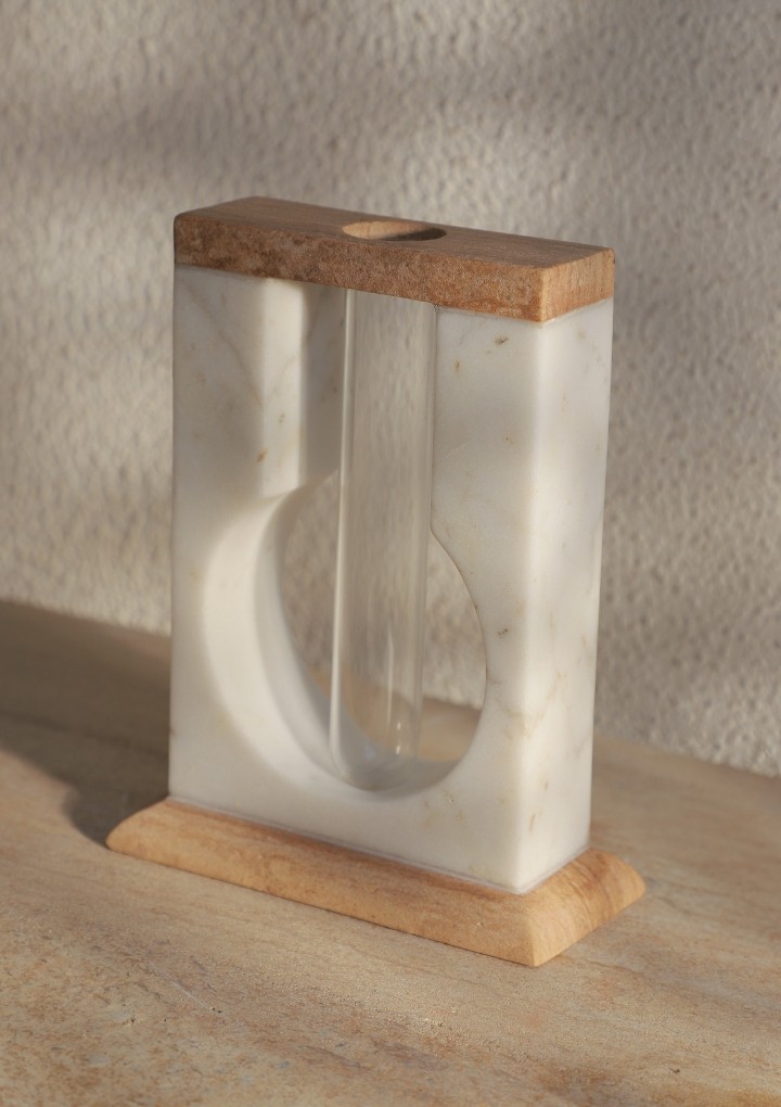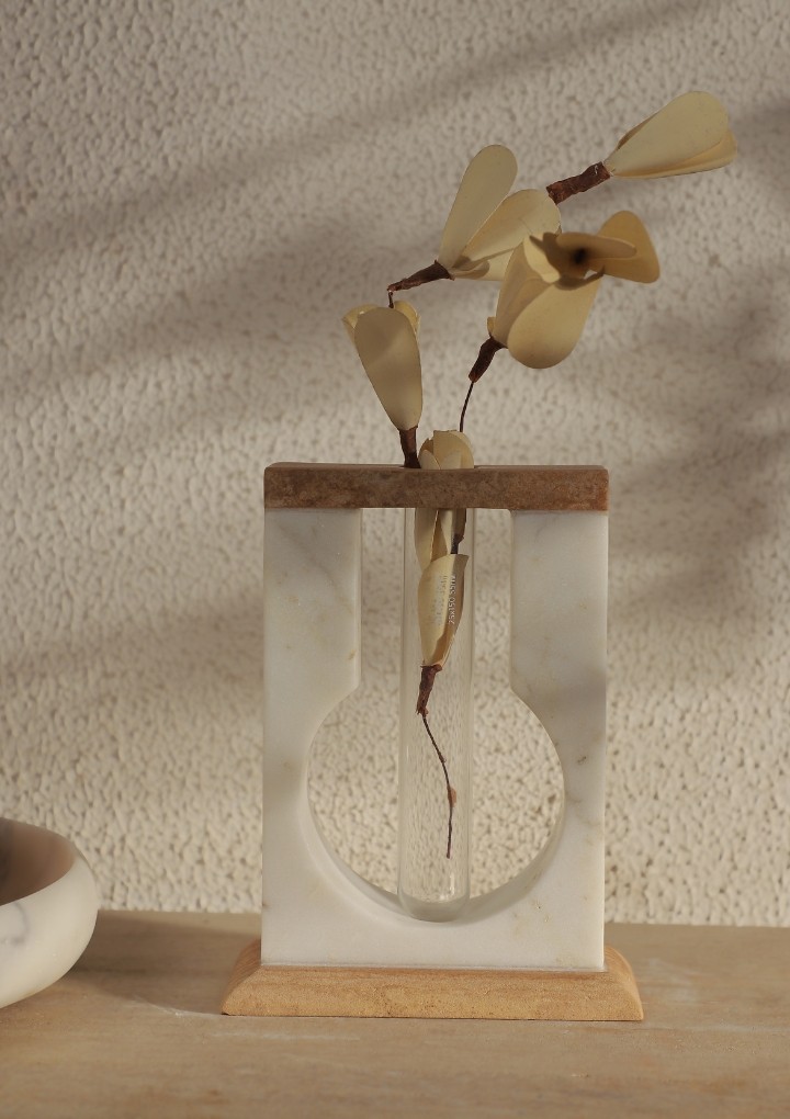 This innovatively designed planter adds elegance to your space. Combination of white marble, wood and glass makes it very contemporary and unique. Adorn it with greens or fresh flowers of your choice.