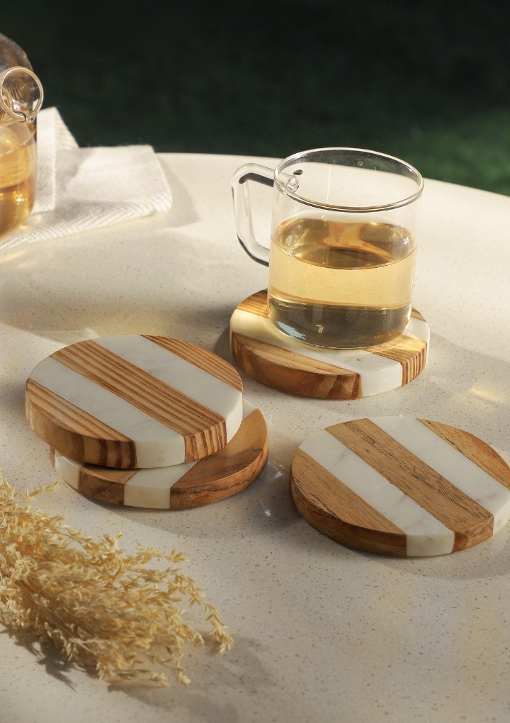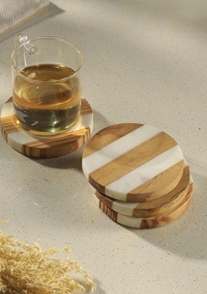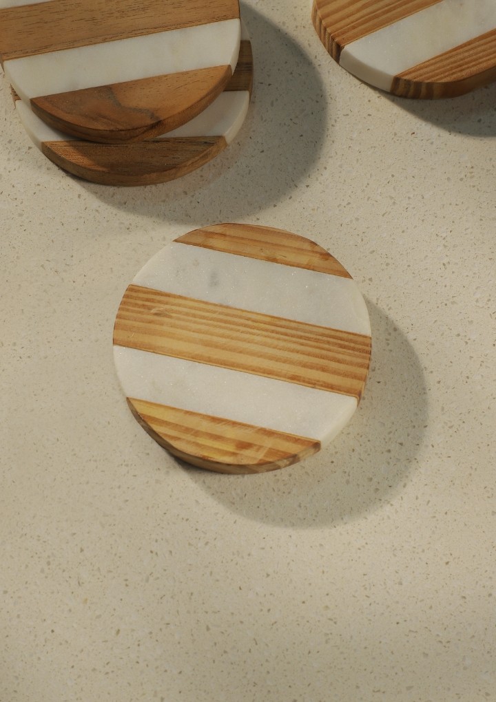 Elevate your table settings with these stunning coasters, featuring amalgamation of two natural materials. Polished marble alternatively placed with rich wood making a unique contrast. These coasters will become a fond part of your daily conversations, adding depth and intrigue to your gatherings.