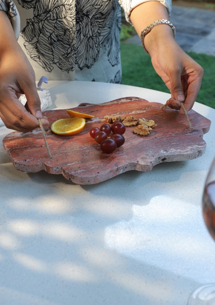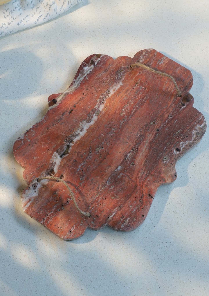 This cheese board crafted in pure red travertine marble is the ultimate accessory for luxury entertaining. With a rich colour and distinctive texture, Travertine has natural pores, patterns and veining. Perfect for any gathering, it is stylish and an opulent way for displaying the finest cheeses and mouth-watering appetisers.