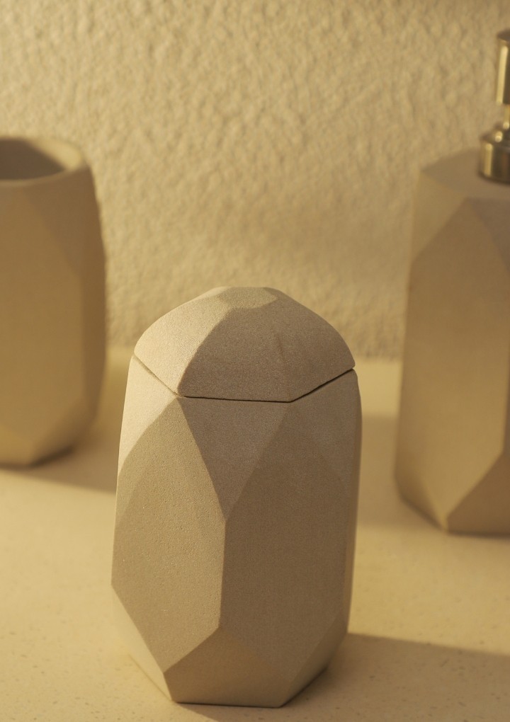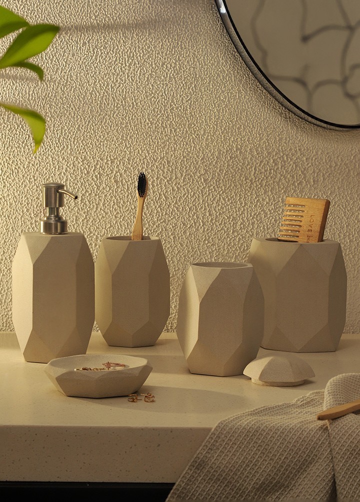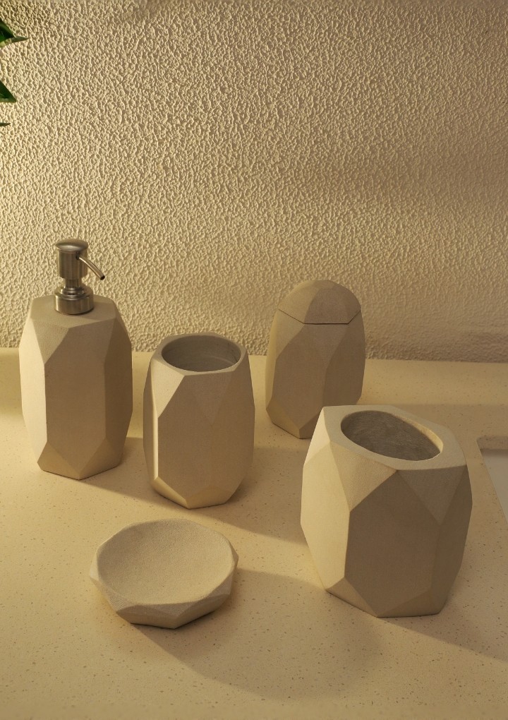 This bathroom set is made of mint sandstone and has a geometric design that looks very modern and opulent. The neutral colour tone of mint sandstone will complement any bathroom. The clean design of this set is sure to make it stand out in any bathroom setting.