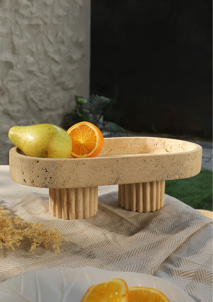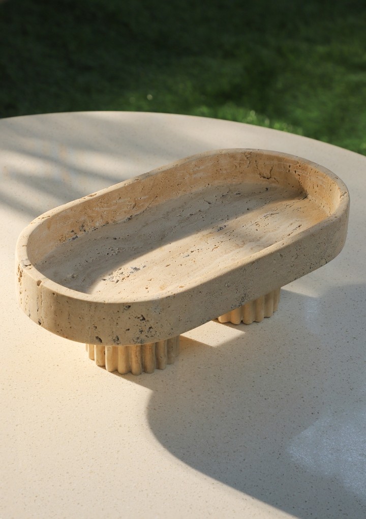 This one–of–a–kind handmade platter is made from natural travertine stone. The holes and veins are nature of this stone. The platter is oval with ribs pillar base which elevates the beauty of this product. The item has matte finish after being sanded down with many different sandpapers to obtain a smooth surface.